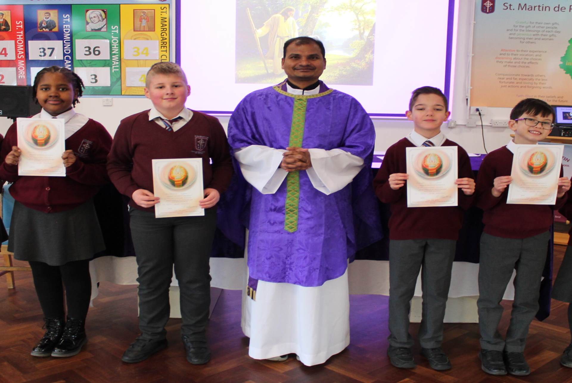 Every effort is made to ensure the vital links between home, school and parish community are established and sustained. The parents are invited to attend meetings with the Parish Priest, Headteacher, and class teacher. For all three sacraments, it is seen as vital that the parents attend both the Commitment Masses and the actual celebrations with their child. Throughout the school year, parents are invited to attend Class Masses. They are asked to support the nurturing of the Faith of their children by encouraging prayers at home and by attending weekly Sunday Mass and by listening to and talking with their child.